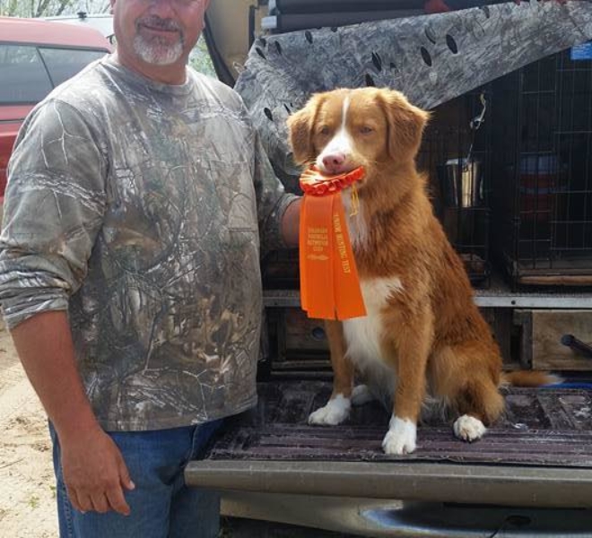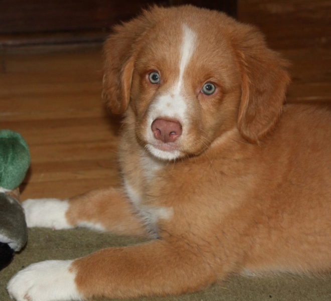 Ruger is the quintessential Toller! A good looking boy with all of the markings that are sought in Toller’s. He has a fun and quirky side with a tremendous sense of humor. I often say that if is Trapper is the professor then Ruger is the frat boy. In other words the life of the party, so much so that is nickname is the clown.