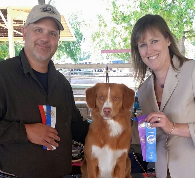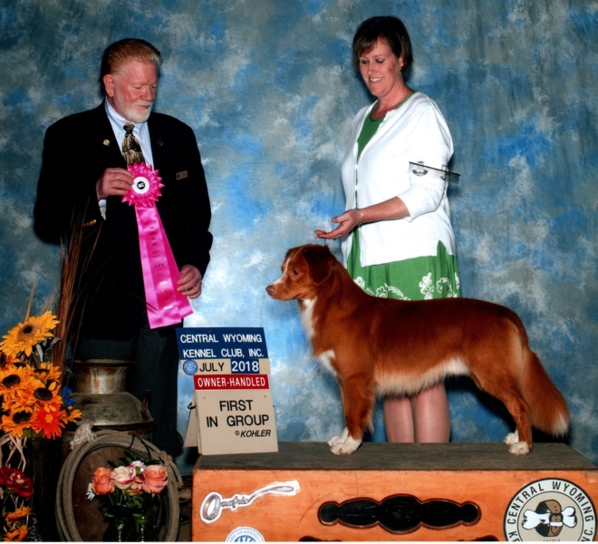 A AKC Silver Grand Champion and a NSDTR USA Club Champion lead off his name but aren’t the only accomplishments in the show ring. He has 3 OH Best in shows, multiple Best of Breeds, multiple Group placements and was the #1 Toller in the country in 2017 & 2018 NOHS. Ruger is a flashy boy who loves to show and his playful side comes out in the ring. He will often entertain the judge with a kiss or two upon examination and isn’t afraid to show Wendy some love on the down and back. He has all the markings, flash and expression that you want to see in a Toller. He is well balanced with a level and straight top line and has beautiful movement. Ruger is a pleasure to watch in the show ring and it’s no surprise that he has done so well in the ring.